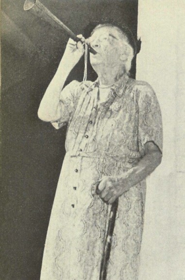 opening town meeting by blowing her horn